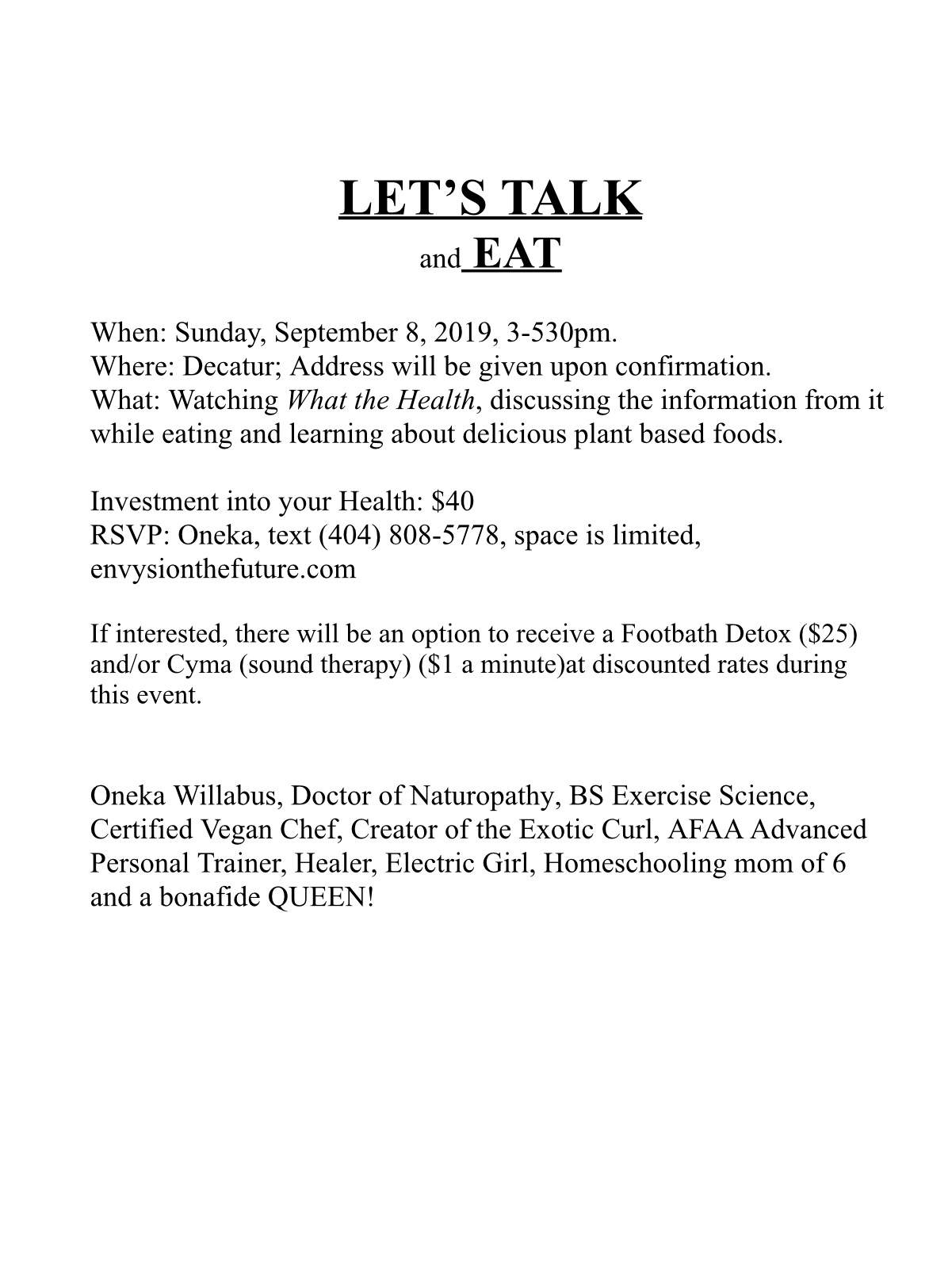 Come out and enjoy a relaxing day of discussion and healthy foods. We will discuss the documentary, What the Health and eat delicious plant based foods. Bring your questions and open minds to this discussion. For anyone wanting to transition to a healthier lifestyle, this is for you! Spaces are limited so don’t miss it! The investment into your health is $40. For payment info, text (404)808-5778. There will be availability to receive Footbath Detox ($25) and Cyma Therapy, sound therapy ($1 a minute) during this event. See you there!
